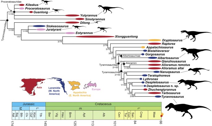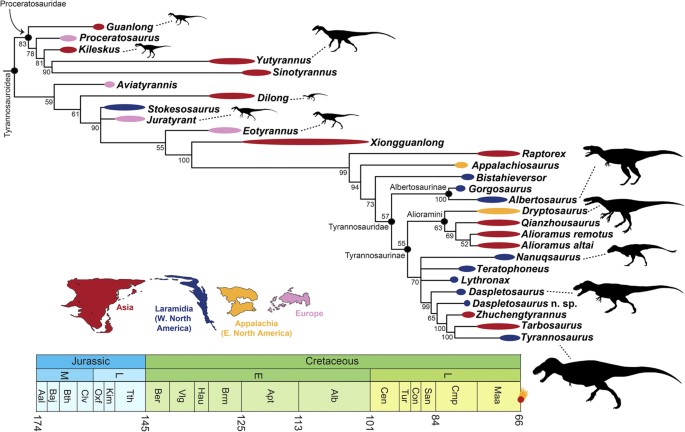 Brusatte e Carr apresentam a análise filogenética mais abrangente dos dinossauros tiranossauroides até aquela data, integrando conjuntos de dados publicados e incorporando táxons recentemente descobertos. A análise com parsimônia e métodos bayesianos, pela primeira vez aplicados a tiranossauroides, recupera a posição de Albertosaurus sarcophagus dentro de Albertosaurinae como táxon-irmão de Gorgosaurus libratus. O estudo demonstra que o plano corporal colossal dos tiranossaurídeos derivados evoluiu de forma fragmentada, que não há uma divisão clara entre espécies do norte e do sul da América do Norte e que T. rex pode ter sido um imigrante asiático. A posição estável de Albertosaurus confirma a monofilia de Albertosaurinae.