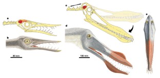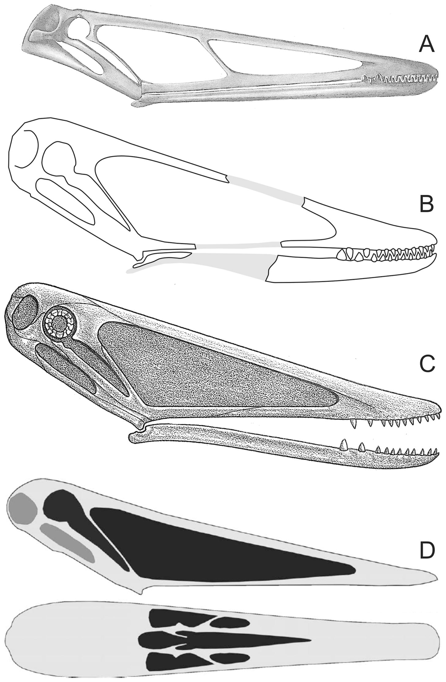 Comparação de crânios de três espécies de istiodactilídeos em escala, ilustrando a variação morfológica do orbital dentro dos Ornithocheiroidea. Bantim et al. (2015) usaram análises similares para demonstrar a variação não específica das cristas em Anhanguera.