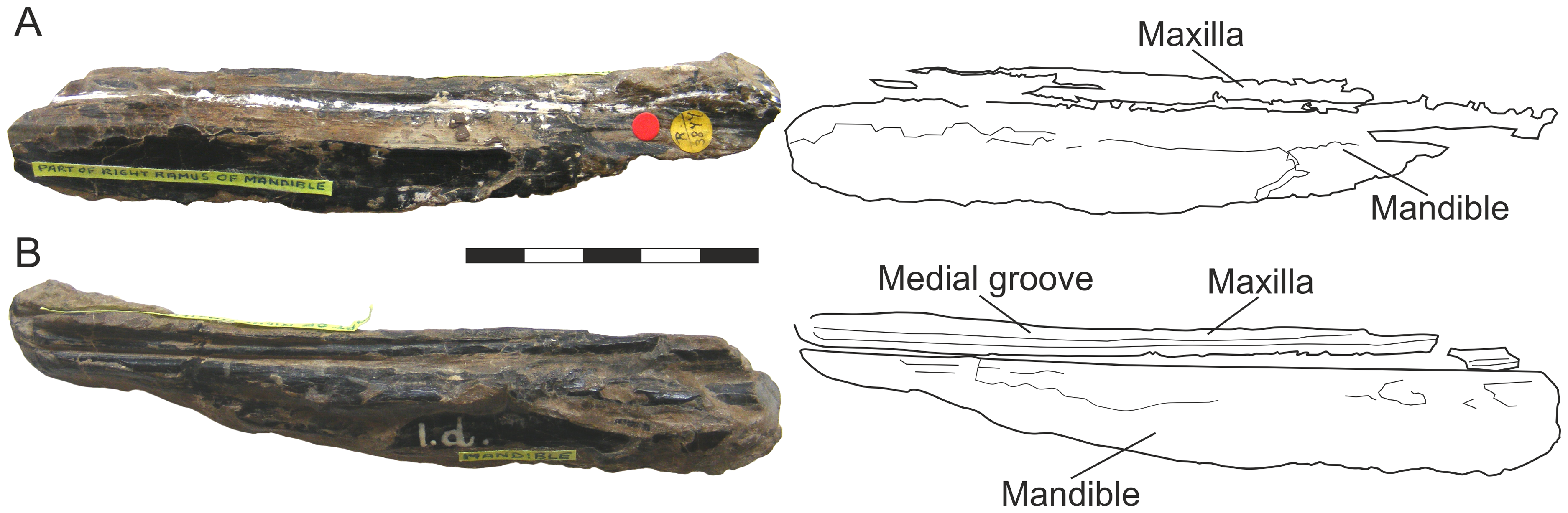 Espécime mandibular de Istiodactylus latidens (NHMUK R3977) em vistas lateral e medial. O parente de Anhanguera dentro dos Ornithocheiroidea, estudado por Witton (2012), contribui para compreender a morfologia craniana comparada entre os grandes pterossauros cretáceos.