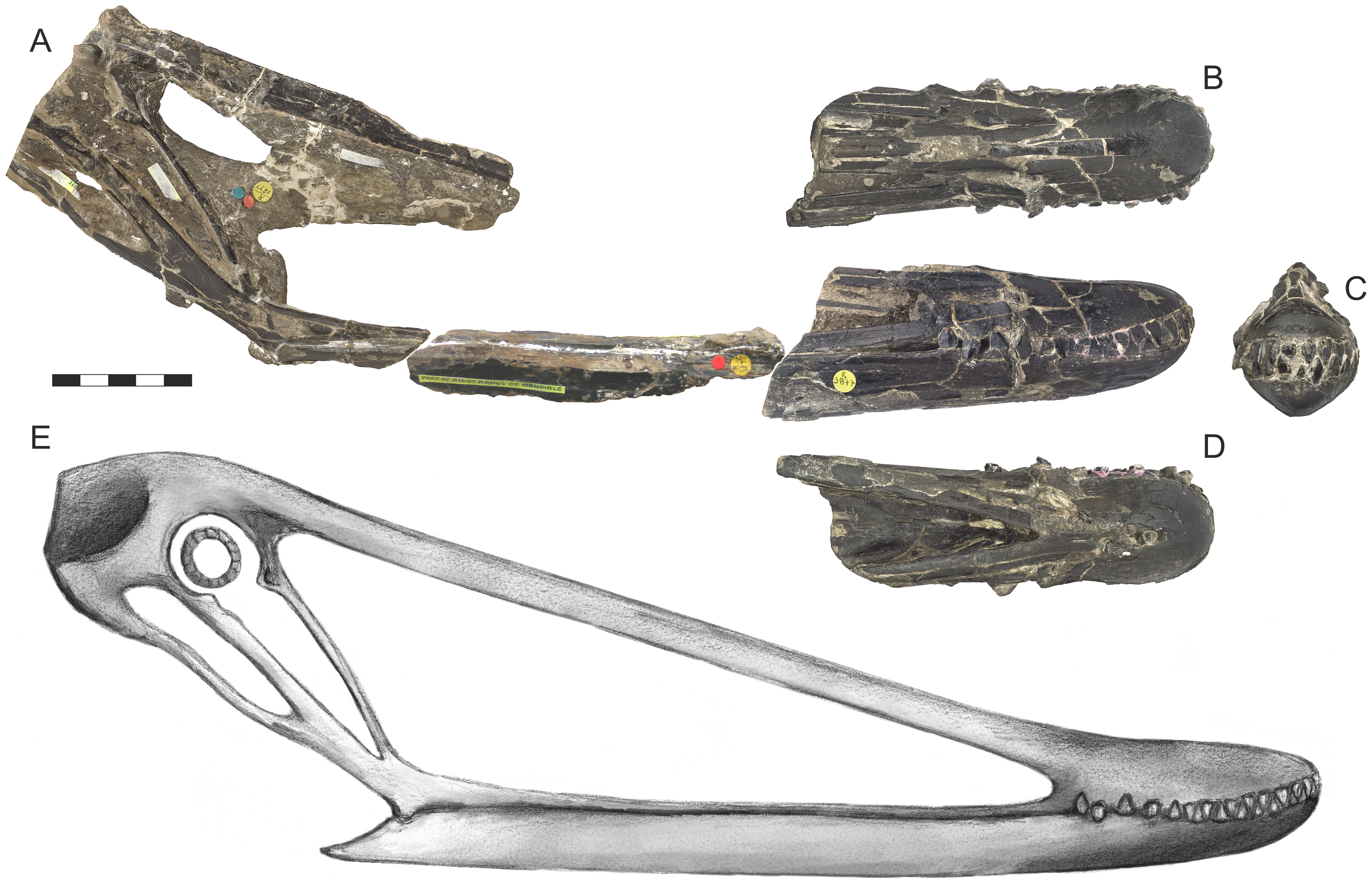 Crânio completo e mandíbula de pterossauro ornithocheiróide em vista lateral, mostrando a morfologia dentária diagnóstica. Bestwick et al. (2018) analisaram caracteres similares em Anhanguera para inferir preferências dietárias e técnicas de pesca.