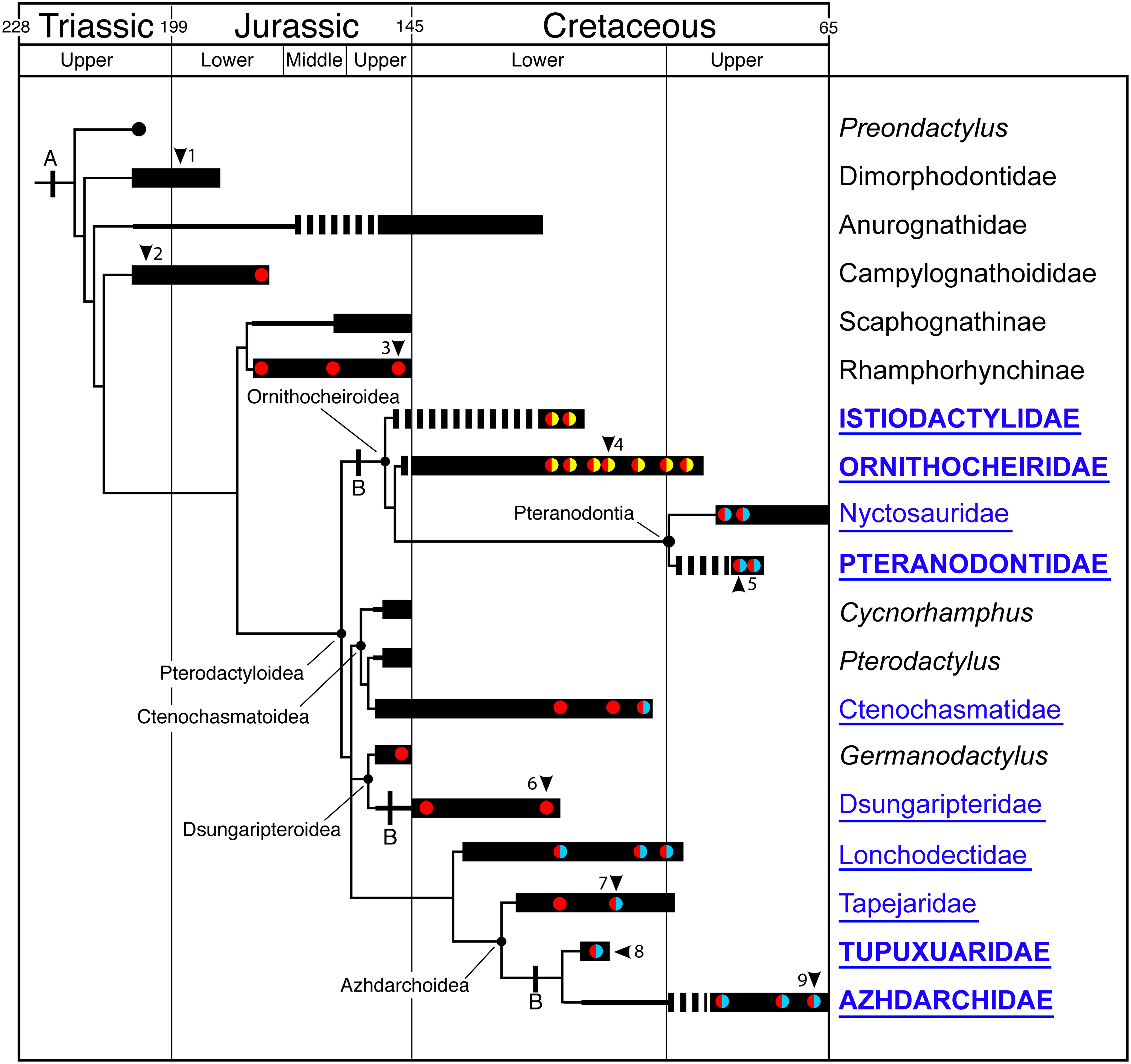 Cladograma de Ornithocheiroidea e Istiodactylidae (Witton, 2012, PLOS ONE), mostrando as relações entre os grandes pterossauros cretáceos. Pinheiro e Rodrigues (2017) utilizaram topologias filogenéticas similares como base para sua revisão taxonômica de Anhanguera.