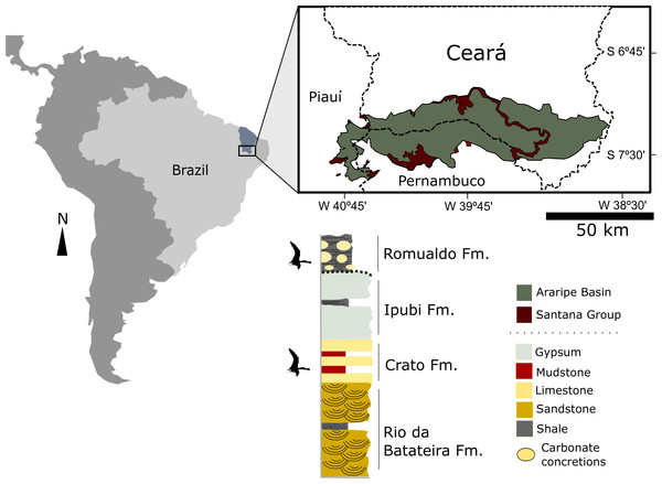 Mapa de localização da Bacia do Araripe, nordeste do Brasil, mostrando a região onde a Formação Romualdo é aflorante e onde os espécimes de Anhanguera blittersdorffi foram coletados.