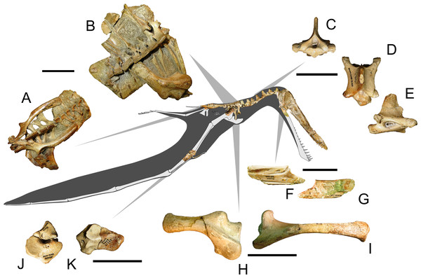 Esqueleto parcial do espécime anhanguerídeo AMNH 22555, mostrando elementos diagnósticos da anatomia pós-craniana do grupo, incluindo pelve, tórax, vértebras cervicais, mandíbula e escápula-coracoide.