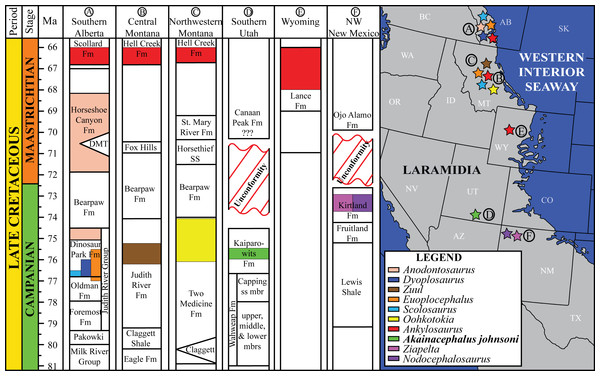 Fig. 1 de Arbour & Currie (2012): mapa de distribuição geográfica e estratigráfica dos espécimes de anquilossauros estudados, incluindo localidades da Hell Creek Formation onde Ankylosaurus magniventris foi coletado.