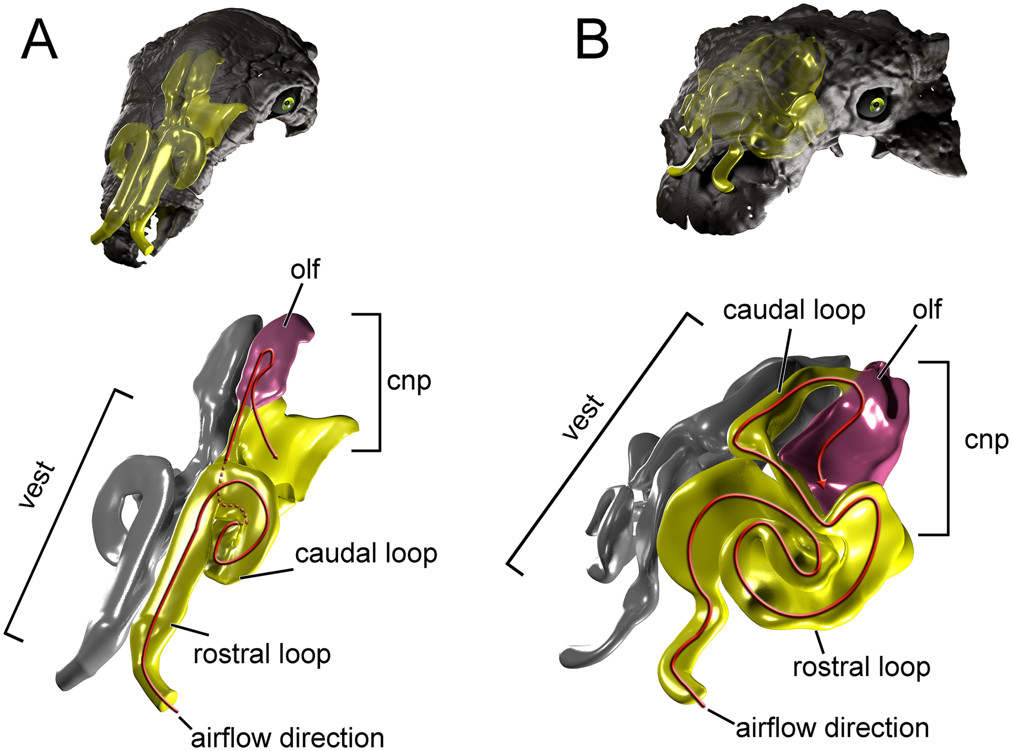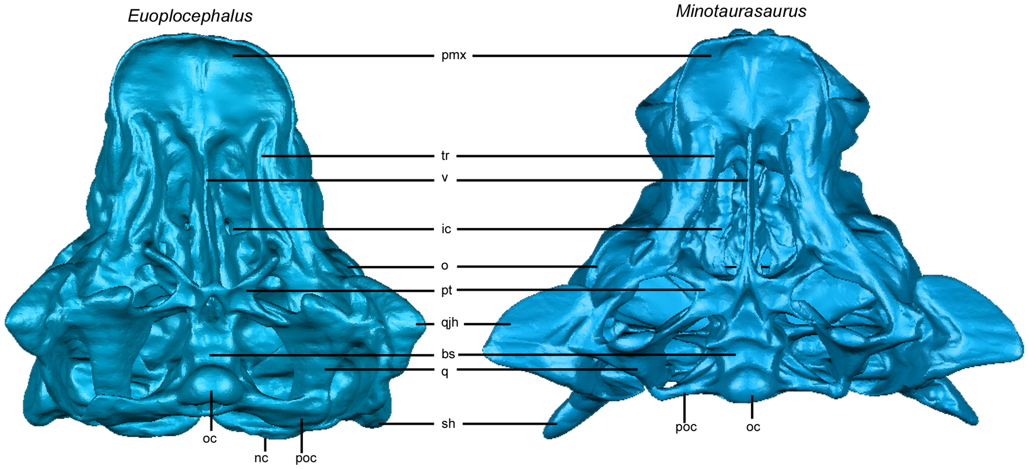 Fig. 2 de Bourke et al. (2018): reconstrução digital das passagens nasais de anquilossauros, evidenciando a complexidade das câmaras nasais que Arbour & Mallon (2017) demonstraram ser ainda mais elaboradas em Ankylosaurus magniventris do que em qualquer outro anquilossauro.