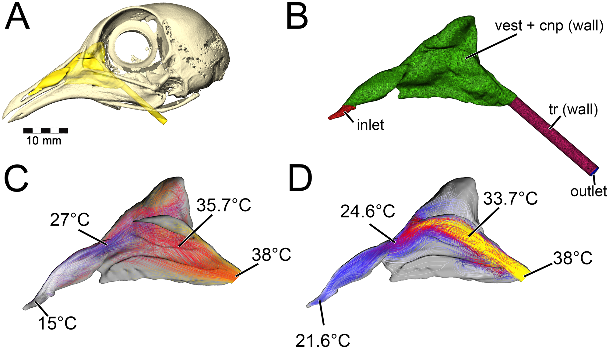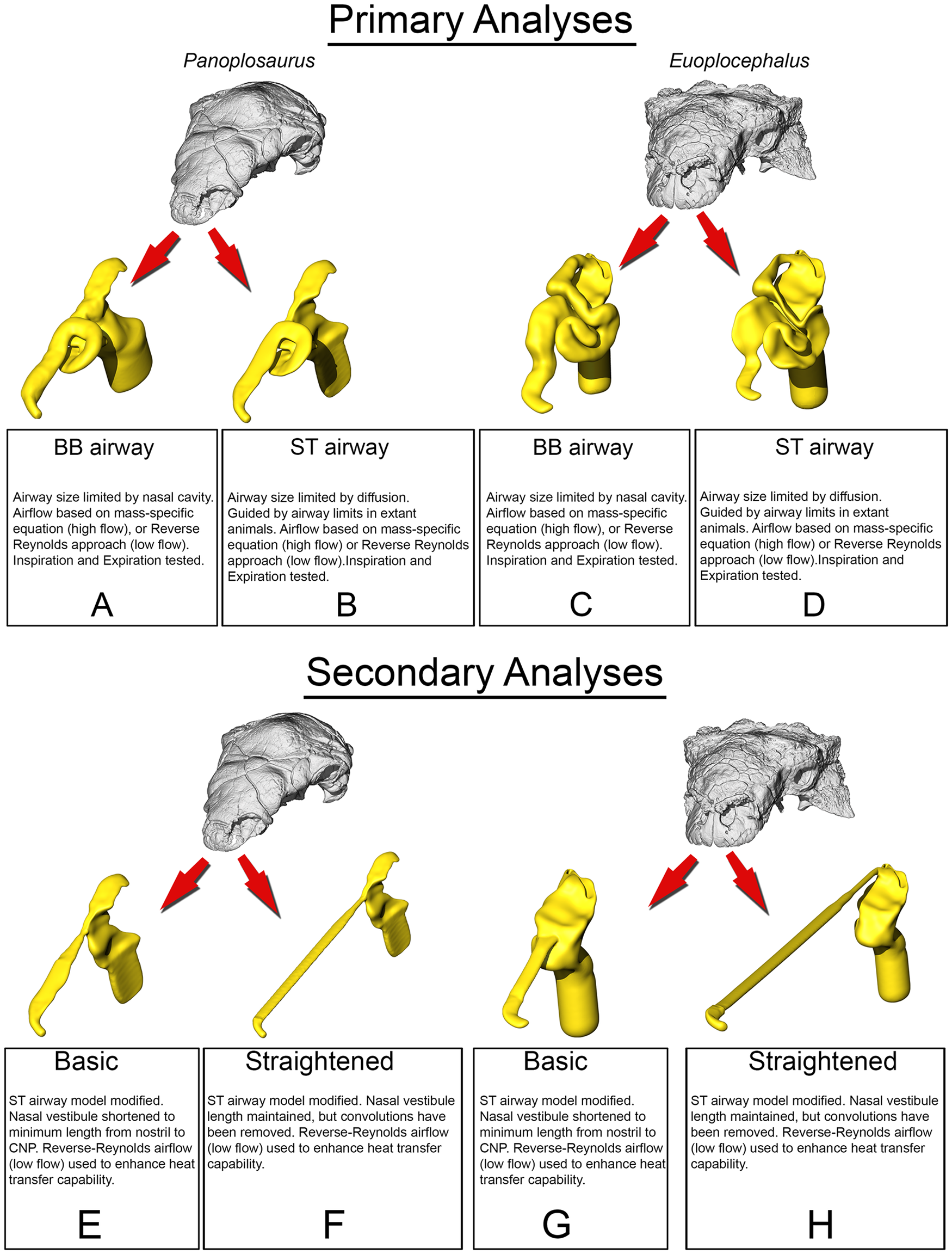 Fig. 1 de Bourke et al. (2018): modelos 3D das passagens nasais de anquilossauros em dinâmica de fluidos computacional, mostrando o fluxo de ar e a eficiência de troca de calor nas passagens convoluídas — análise diretamente aplicável à morfologia nasal única de Ankylosaurus.