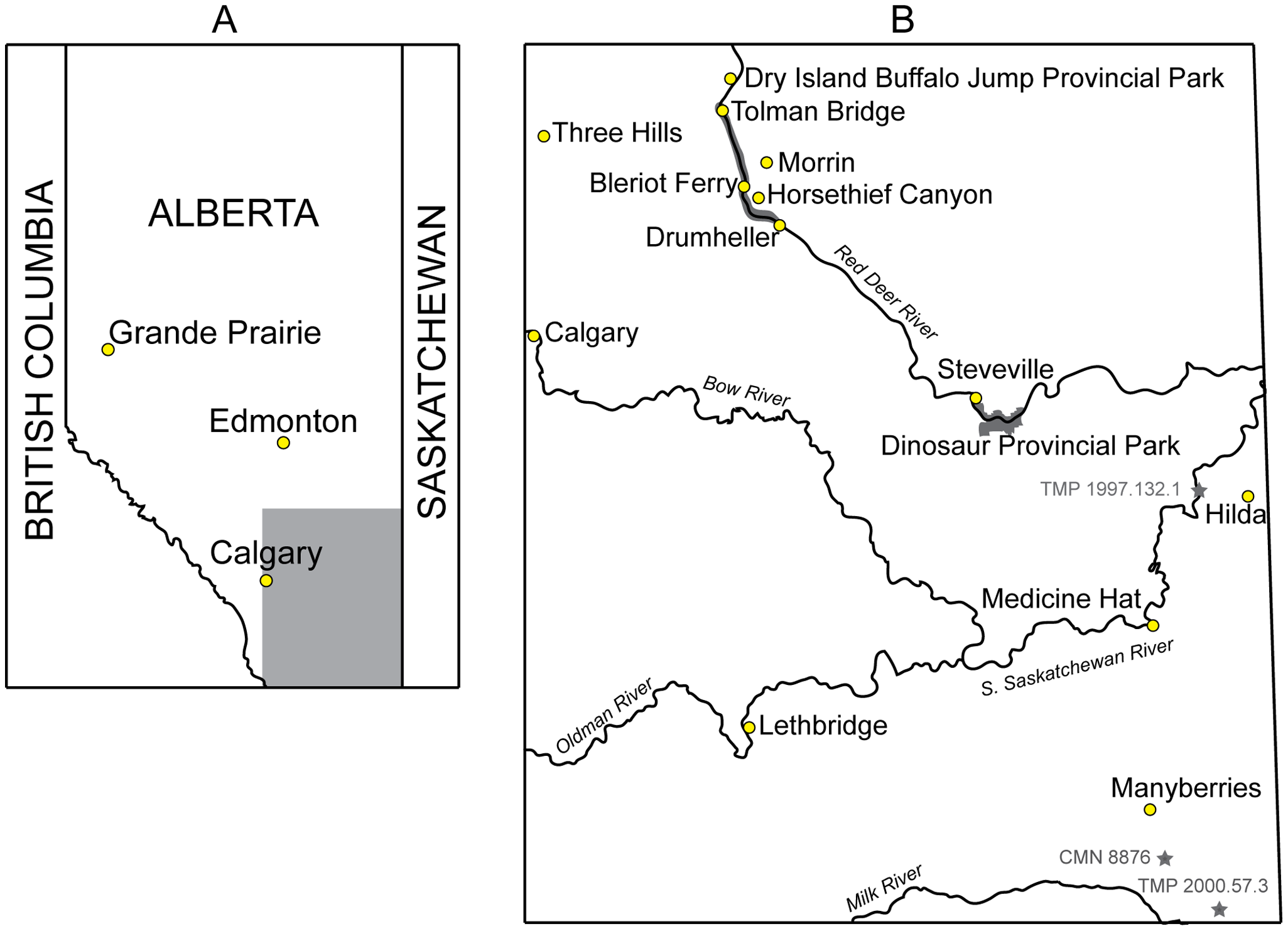 Fig. 1 de Arbour & Currie (2013): mapa de distribuição geográfica dos espécimes de anquilossaurídeos da América do Norte, incluindo localidades de Ankylosaurus magniventris na Hell Creek Formation e equivalentes.
