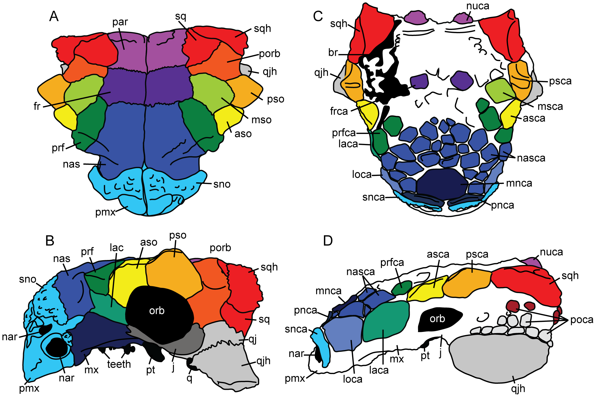 Figura 4 de Arbour & Mallon (2017): crânios de três anquilossaurinos em vista lateral com os osteodermos cranianos (caputegulae) coloridos para comparação — AMNH 5214 (Ankylosaurus magniventris), UALVP 31 (Euoplocephalus tutus) e SMP VP900 (Nodocephalosaurus kirtlandensis). A figura demonstra visualmente o que há de único em Ankylosaurus: a narina externa (nar) voltada lateralmente e coberta pelo osteodermo loreal (laca), enquanto em Euoplocephalus a narina fica anterior, coberta por um arco de osteodermo supranarial (snca).
