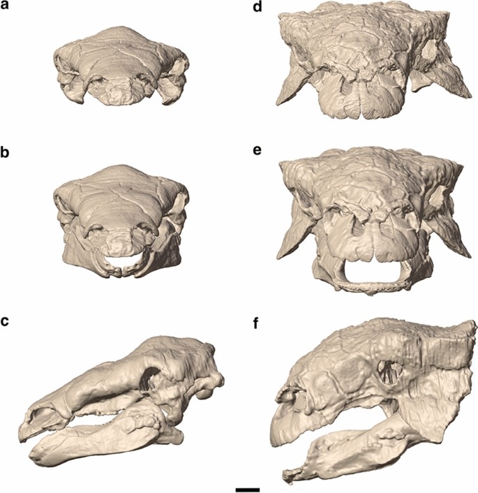 Fig. 1 de Ballell et al. (2023): modelos digitais 3D de crânios de anquilossauros usados na análise de elementos finitos, incluindo representantes de Ankylosauridae e Nodosauridae para comparação biomecânica.