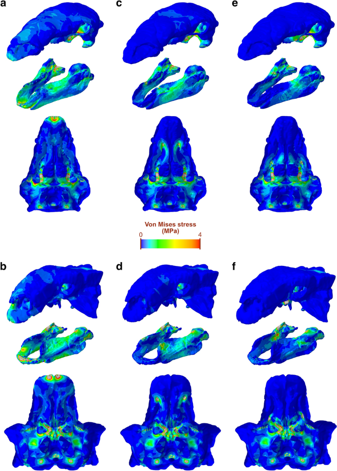 Fig. 4 de Ballell et al. (2023): distribuição de estresse de Von Mises nos crânios de anquilossauros durante a mordida, mostrando que anquilossaurídeos distribuem forças de forma mais ampla que nodossaurídeos, padrão que se aplica a Ankylosaurus com seu crânio excepcionalmente largo.
