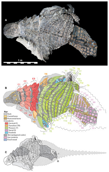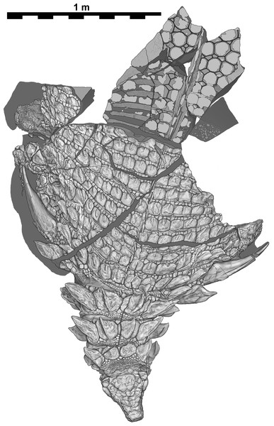 Vista dorsal anatômica do holótipo de Borealopelta markmitchelli, publicada por Caleb M. Brown (2017) em PeerJ. A imagem ilustra a disposição dos osteodermos e os grandes espinhos parascapulares característicos da espécie.