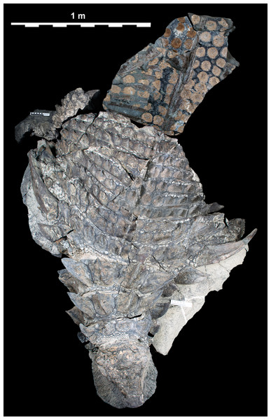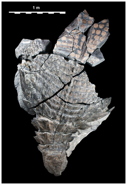 Vista da superfície dorsal do holótipo de Borealopelta no Royal Tyrrell Museum, revelando a disposição simétrica dos osteodermos e espinhos ao longo do eixo do corpo, caracteres fundamentais para a análise filogenética de Ankylosauria.