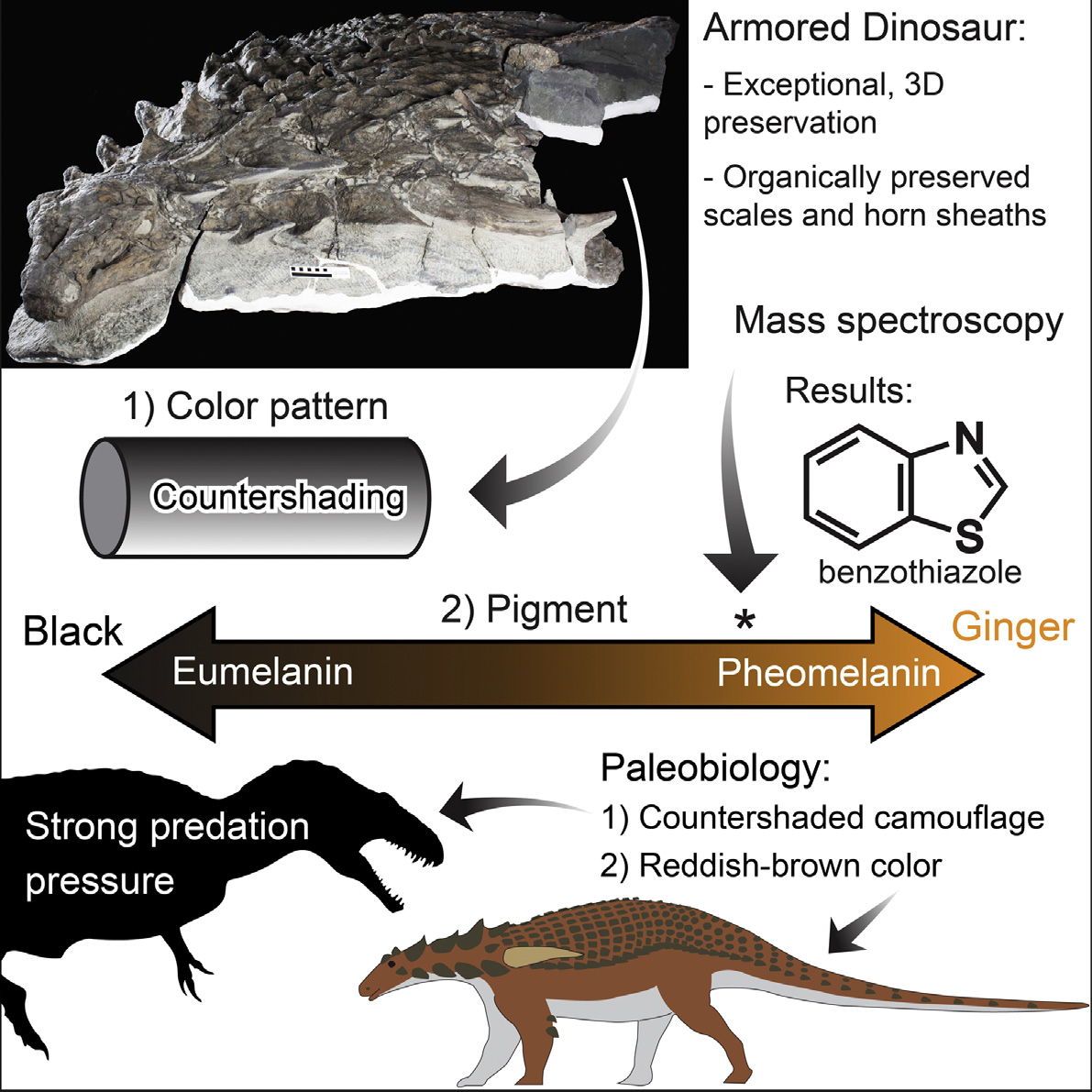 Artigo fundador que descreve o holótipo TMP 2011.033.0001, o Borealopelta markmitchelli, como o nodossaurídeo mais bem preservado do mundo. Brown e colegas realizam análise química dos pigmentos orgânicos preservados na pele e osteodermos, identificando melanina distribuída em padrão de contrassombreamento: dorso escuro, ventre mais claro. O contrassombreamento, comum em presas de grandes predadores modernos, é inesperado em um animal de 1,3 tonelada com armadura completa. Os autores concluem que a pressão de predação na fauna do Albiano era suficientemente intensa para selecionar camuflagem mesmo em um megaherbívoro blindado. A análise filogenética posiciona a espécie dentro de Nodosauridae, próxima a Pawpawsaurus e Europelta.