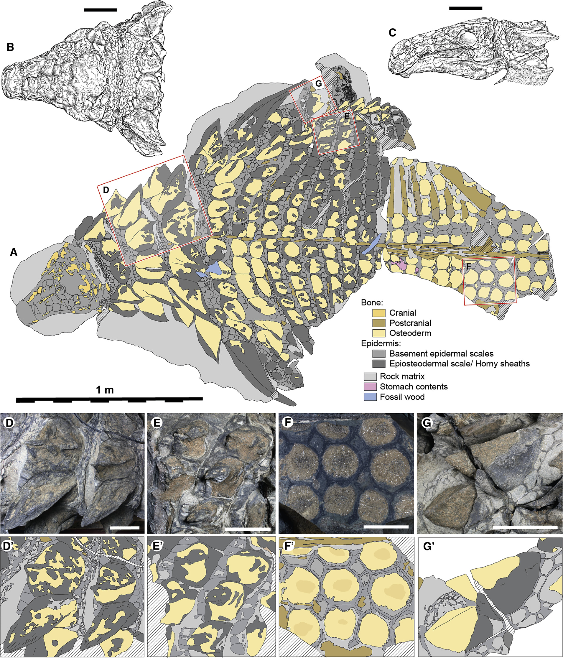 Estudo osteológico e morfométrico detalhado de 172 osteodermos do holótipo de Borealopelta markmitchelli. Brown quantifica o tamanho, a forma e as proporções dos osteodermos ósseos e, de forma inédita, das bainhas de queratina que os recobrem, preservadas em caráter excepcional. A análise alométrica demonstra que a altura dos espinhos é positivamente alométrica em relação às dimensões basais dos osteodermos. O trabalho estabelece que as bainhas queratinosas aumentavam substancialmente o tamanho aparente de cada estrutura defensiva, implicando que a armadura real do animal era ainda mais imponente do que os ossos isolados sugerem. As descrições anatômicas detalhadas e as fotografias de alta resolução tornam este artigo a referência primária para a morfologia dos osteodermos de nodossaurídeos.