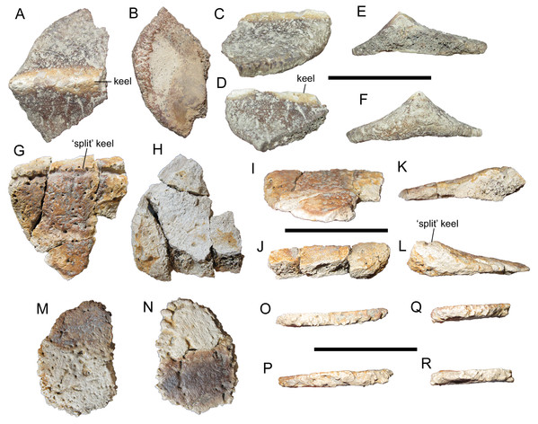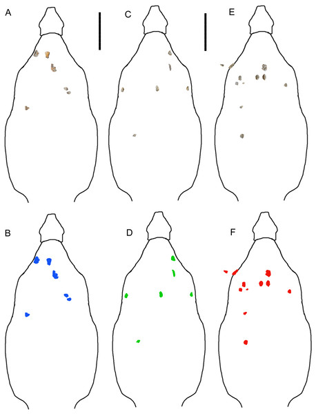 Diagramas esquemáticos dos osteodermos de Borealopelta markmitchelli publicados por Caleb M. Brown (2017) em PeerJ, mostrando morfologia, proporções e distribuição anatômica das estruturas defensivas ao longo do corpo.