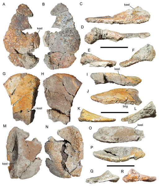 Detalhe da armadura do espécime AMNH de Sauropelta edwardsorum. A morfologia dos osteodermos de nodossaurídeos como Sauropelta é diretamente comparada com os caracteres de Thyreophora analisados por Maidment et al. (2018), sendo relevante para entender a filogenia de Borealopelta.