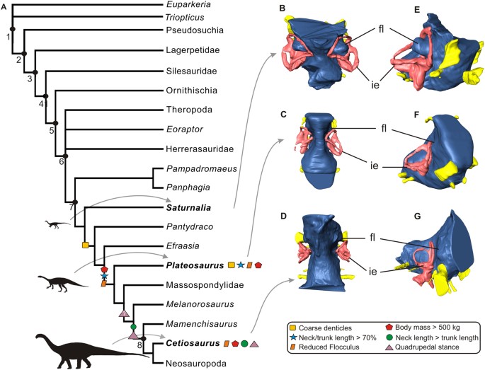 Primeiro endocast reconstruído de um dinossauro carniano (Saturnalia tupiniquim). Estabelece o referencial comparativo direto para o endocrânio de Buriolestes apresentado por Müller et al. (2021) e para a discussão sobre a evolução do cérebro nos sauropodomorfos.
