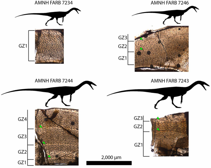 Analise osteohistológica de múltiplos espécimes de Coelophysis bauri de Ghost Ranch que revela trajetorias de crescimento individual altamente variáveis. Diferentemente das curvas de crescimento previsiveis de dinossauros mais derivados, Coelophysis mostra diferenças marcantes na taxa e padrão de crescimento entre individuos de tamanho similar. Essa variabilidade pode representar uma condição primitiva para Dinosauria, sugerindo que o crescimento mais canalizado visto em grupos derivados evoluiu posteriormente. O estudo e públicado na Scientific Reports com acesso aberto, incluindo imagens histologicas detalhadas dos cortes ósseos e graficos de crescimento comparativo.