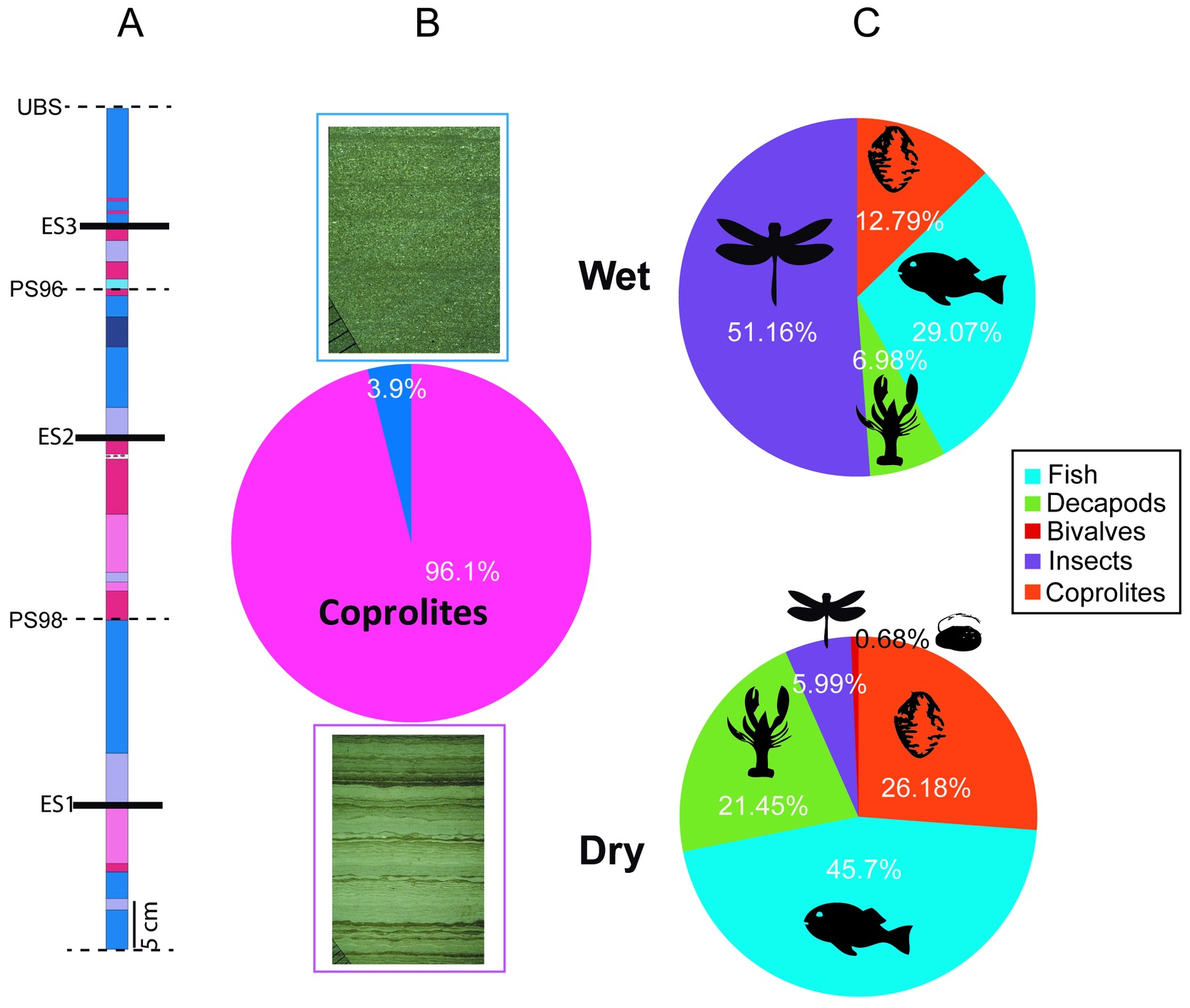 Barrios-de Pedro et al. descrevem mais de 2.000 coprólitos fósseis do sítio de Las Hoyas, o mesmo ecossistema do Cretáceo Inferior que produziu o Concavenator. A análise morfológica de 433 amostras revela uma assembleia dominada por morfotipos cilíndricos e em fita, atribuíveis a carnívoros com dietas baseadas em peixes. O trabalho fornece evidência direta das interações tróficas do ecossistema: os produtores mais prováveis dos coprólitos de maior tamanho são terópodes grandes como o Concavenator. A preservação excepcional dos coprólitos em Las Hoyas, relacionada ao desenvolvimento de tapetes microbianos no fundo dos lagos, é o mesmo fenômeno que preservou o esqueleto articulado do Concavenator. O estudo integra dados icnológicos, sedimentológicos e paleobiológicos para reconstruir a cadeia alimentar do Barremiano ibérico, posicionando o Concavenator no topo da pirâmide trófica terrestre.