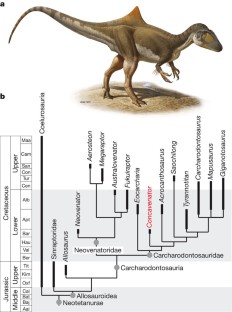 Novas et al. sintetizam a evolução dos dinossauros carnívoros do Cretáceo na Patagônia, discutindo a origem e dispersão dos grandes carcarodontossaurídeos entre os supercontinentes. O Concavenator é abordado no contexto biogeográfico: sua descoberta na Espanha sugere que carcarodontossaurídeos de médio porte habitavam a Europa no Barremiano, antes que os gigantes sul-americanos (Giganotosaurus, Mapusaurus, Tyrannotitan) se diversificassem no Albiano-Cenomaniano. O trabalho propõe que a linhagem que levou ao Concavenator e ao Neovenator surgiu na Laurásia Ocidental e eventualmente gerou, por dispersão, os ancestrais dos carcarodontossaurídeos do Gondwana. A análise filogenética e biogeográfica discute a janela temporal e os corredores dispersivos possíveis entre a Europa do Barremiano e a América do Sul do Albiano, incluindo conexões via África.
