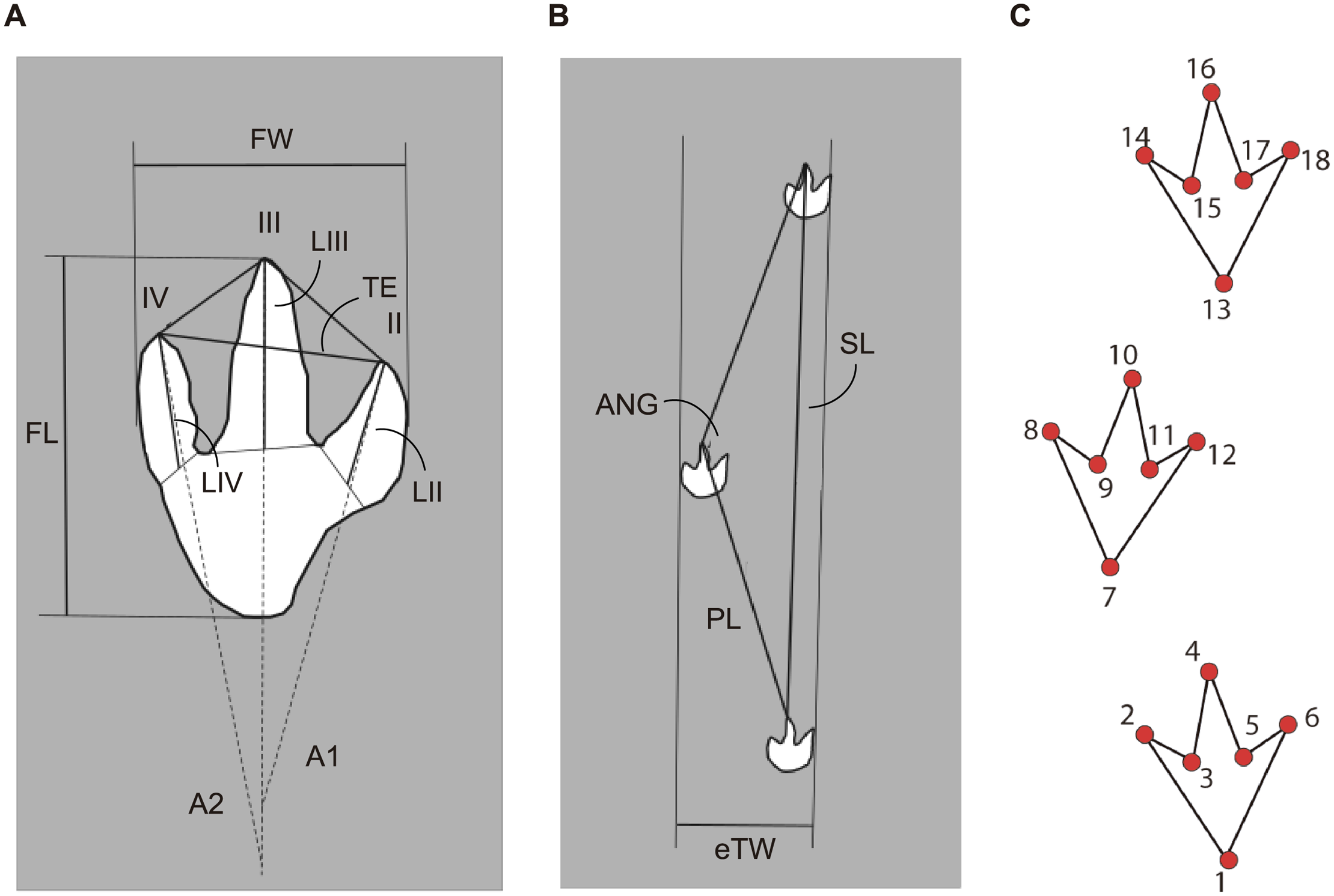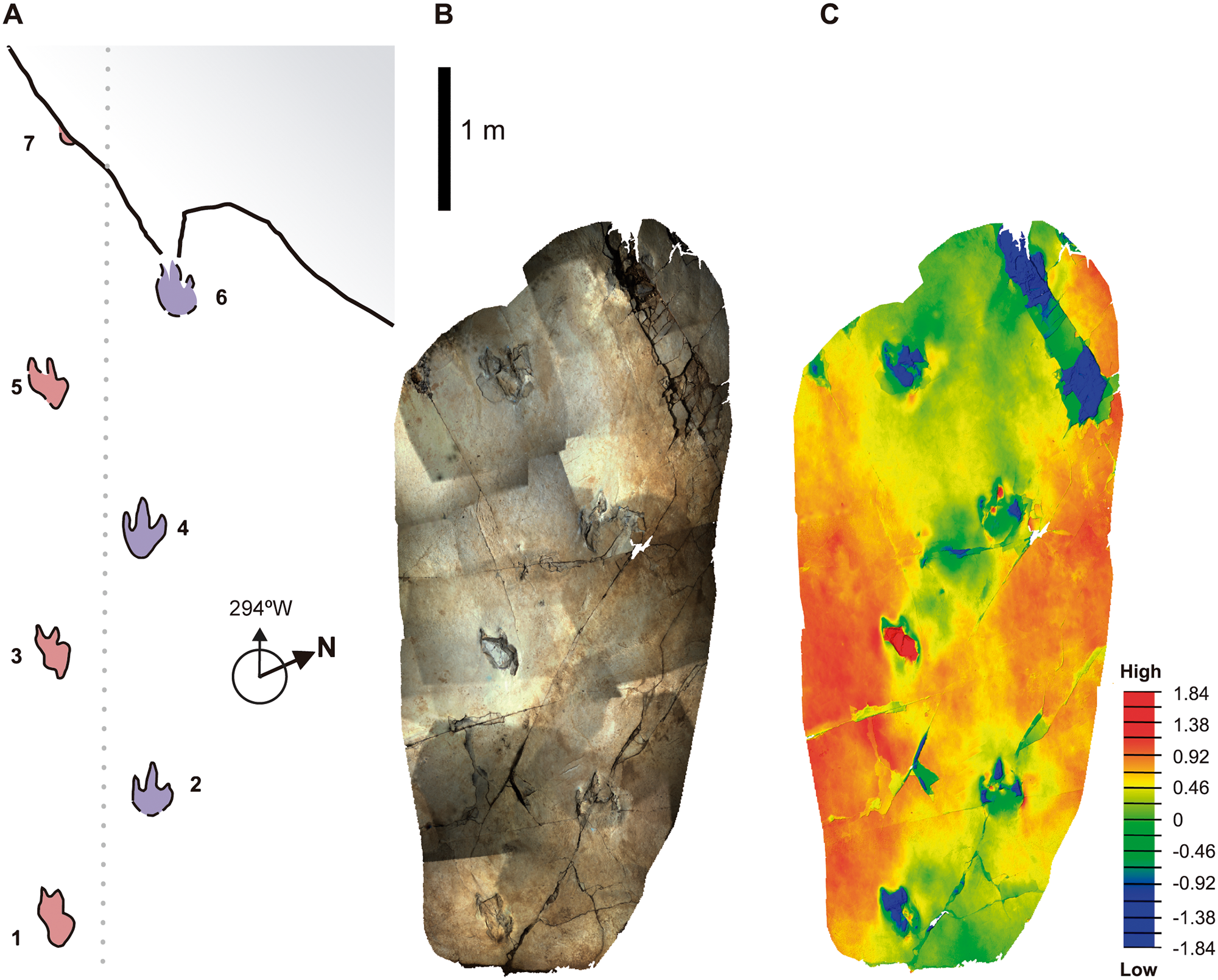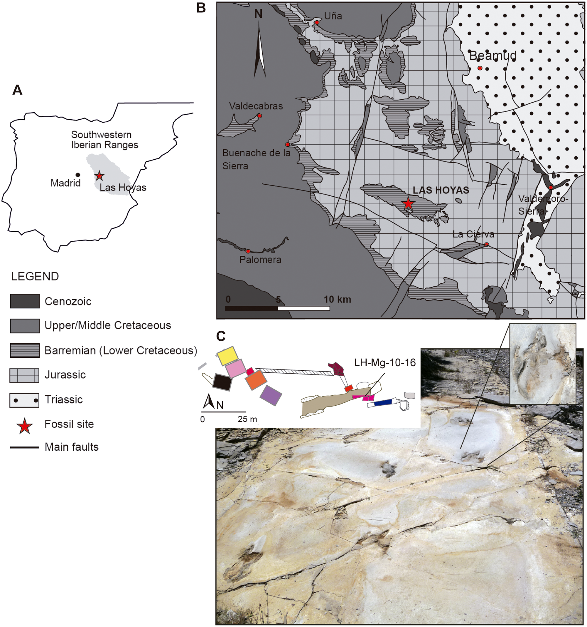 Herrera-Castillo et al. descrevem uma pista de passadas (LH-Mg-10-16) encontrada em Las Hoyas com características incomuns: passos largos e um conjunto de impressões esquerdas igualmente deformadas com dígito dislocado. Utilizando análise icnológica, varredura 3D, seções finas e morfometria geométrica comparada com 75 pistas de dinossauros bípedes, os autores concluem que as impressões foram feitas por um único terópode grande com pé patológico, estimando a altura do quadril em aproximadamente 2 metros. Esse tamanho é compatível com o Concavenator, único grande terópode conhecido de Las Hoyas. O trabalho fornece evidência icnológica de comportamento e patologia em um terópode que pode ser o Concavenator, complementando os dados anatômicos do holótipo esquelético. A pista sugere que o animal atravessou uma área de água rasa caminhando vagarosamente em direção à principal fonte d'água.