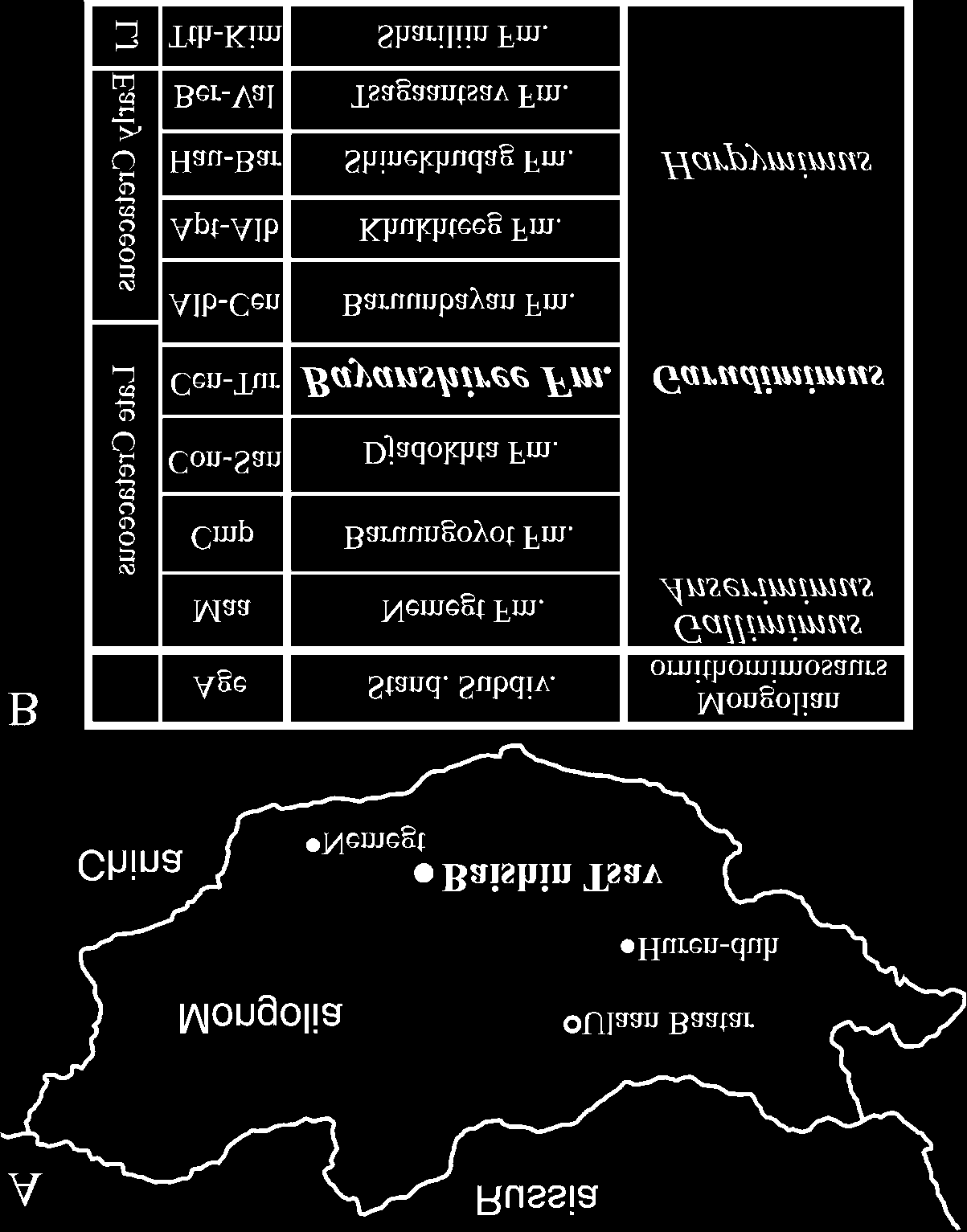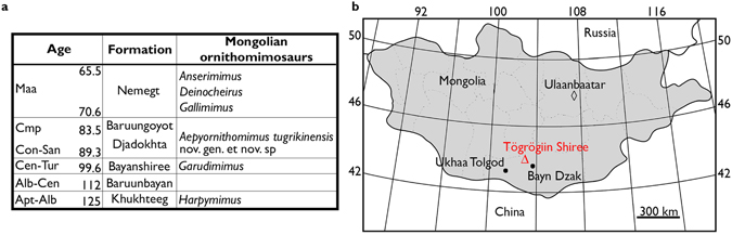 Este artigo discute as atribuições estratigráficas e responsabilidades institucionais para as camadas fossilíferas do Deserto de Gobi com ornitomimossauros. Publicado em 2009, pouco antes das expedições que recuperaram os novos espécimes de Deinocheirus, o artigo documenta o contexto acadêmico e geográfico da exploração paleontológica da região. As localidades discutidas incluem áreas da Formação Nemegt que produziram os espécimes MPC-D 100/127 e MPC-D 100/128 descritos em 2014.