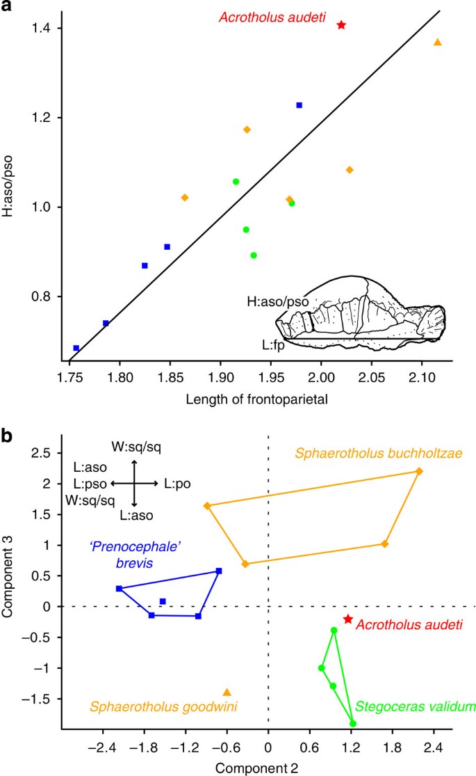 Descrição do pachicefalossaurídeo mais antigo da América do Norte, que fornece novo contexto para avaliar a hipótese de sinonímia ontogenética de Dracorex hogwartsia e Stygimoloch spinifer. Evans e colaboradores revelam diversidade inesperada em dinossauros ornitísquios de pequeno porte e argumentam que a variação morfológica dos crânios planos versus abobadados pode refletir, ao menos em parte, diversidade taxonômica real e não apenas ontogenia. O trabalho demonstra que linhagens de pachicefalossaurídeos de crânio plano ou baixo existiram ao longo da história evolutiva do grupo, e não apenas como estágios juvenis dos abobadados. Isso enfraquece o argumento de que todos os crânios planos são necessariamente juvenis, e fortalece a possibilidade de que Dracorex seja uma espécie distinta. O estudo também ilumina a biogeografia dos pachicefalossaurídeos norte-americanos e as extinções no final do Cretáceo.