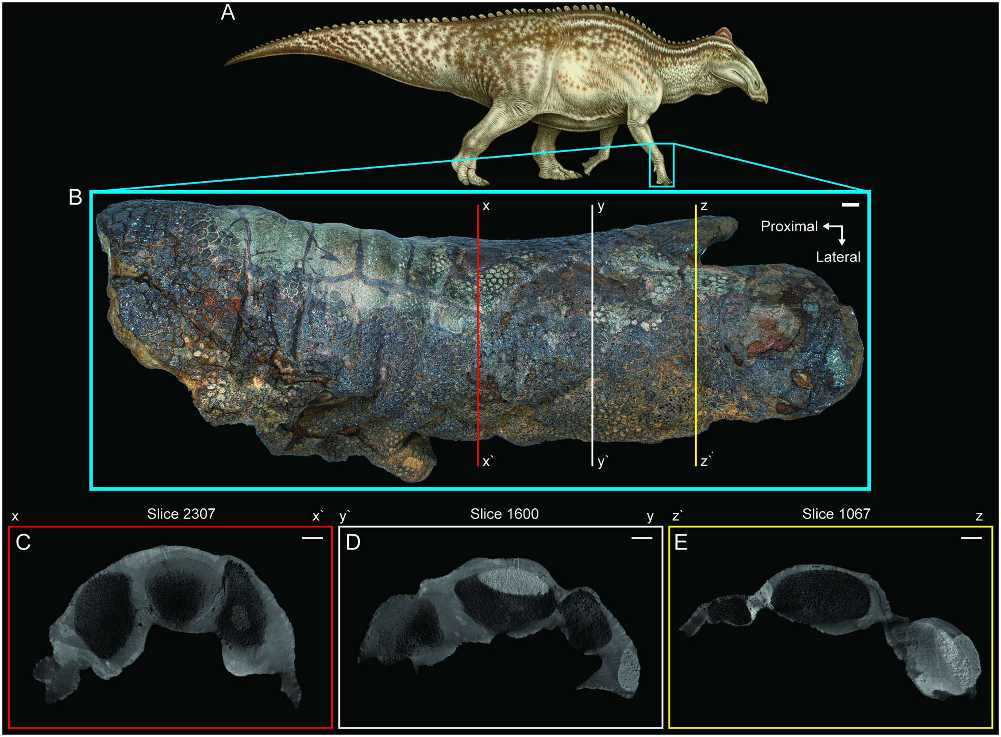 Anné et al. utilizam tomografia computadorizada para criar modelos 3D das vértebras caudais de espécimes de Edmontosaurus annectens e analisam lesões vertebrais incomuns. A distribuição e morfologia das lesões são mais consistentes com estresse biomecânico de longa duração causado por movimentos laterais e dorsoventrais da cauda, provavelmente relacionados com interações intraespecíficas e locomoção em indivíduos facultativamente quadrúpedes. As lesões diferem de marcas de mordida ou trauma agudo, sugerindo sobrecarga crônica das vértebras caudais durante a vida do animal. O estudo fornece janela única para o comportamento e biomecânica de locomoção de Edmontosaurus, complementando as análises de desgaste dental e histologia óssea. As lesões caudais podem indicar comportamento de luta intra-específica com uso da cauda como arma ou instrumento de comunicação social, comportamento observado em muitos herbívoros sociais modernos.