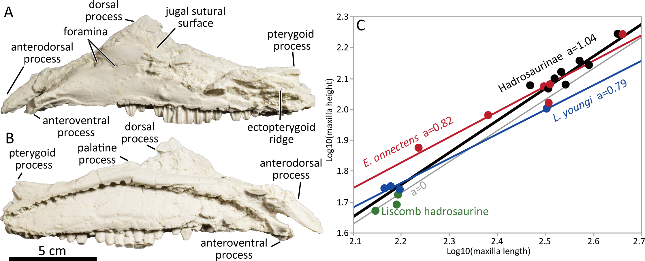 Estudo morfométrico decisivo que resolve a controversa taxonomia dos edmontossauros. Campione e Evans analisam virtualmente todos os crânios completos conhecidos e concluem que apenas duas espécies são válidas: E. regalis (Campaniano tardio) e E. annectens (Maastrichtiano tardio). O polêmico Anatotitan copei, frequentemente tratado como gênero separado em livros populares de dinossauros, é sinonimizado com E. annectens: as diferenças morfológicas que sustentavam Anatotitan são explicadas pelo crescimento alométrico e pelo aumento ontogenético do tamanho do crânio. O estudo também sugere que a diversidade de megaherbívoros declinou do início para o final do Maastrichtiano, antes da extinção de fim de Cretáceo, em consonância com outras linhas de evidência sobre o colapso ecológico pré-KPg. Os autores utilizam análise de componentes principais e análise de agrupamento hierárquico, tornando o trabalho um modelo metodológico para estudos taxonômicos de hadrossaurídeos.