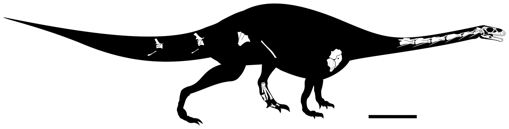 Diagrama esquelético de Eoraptor lunensis mostrando os elementos ósseos conhecidos (branco) e inferidos (cinza), baseado no holótipo PVSJ 512. Um dos dinossauros do Triássico mais completamente conhecidos.