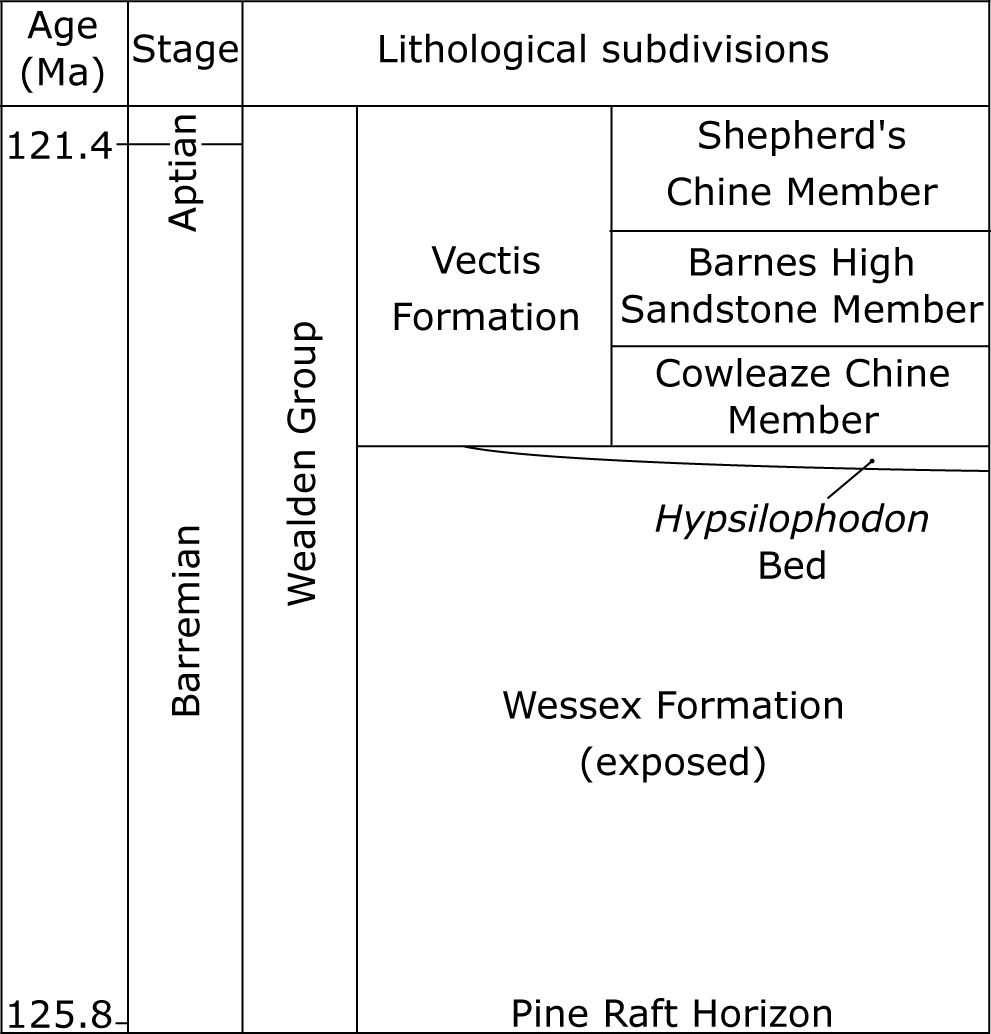 A Formação Wessex (Grupo Wealden) é uma unidade sedimentar do Barremiano (~130-125 Ma) da Ilha de Wight, sul da Inglaterra. Representa depósitos fluviais de alta sinuosidade em uma planície de inundação com relevo suave, sob clima quente e sazonal, com períodos de aridez documentados por rachaduras de dessecação e caliches. A vegetação era dominada por coníferas Cheirolepidiaceae. Além do Hypsilophodon, a formação preservou Iguanodon, Neovenator, Baryonyx, Polacanthus, Eotyrannus, pterossauros, crocodilos, tartarugas e mamíferos. O Hypsilophodon Bed, no topo da formação, é a camada mais produtiva em espécimes desta espécie.