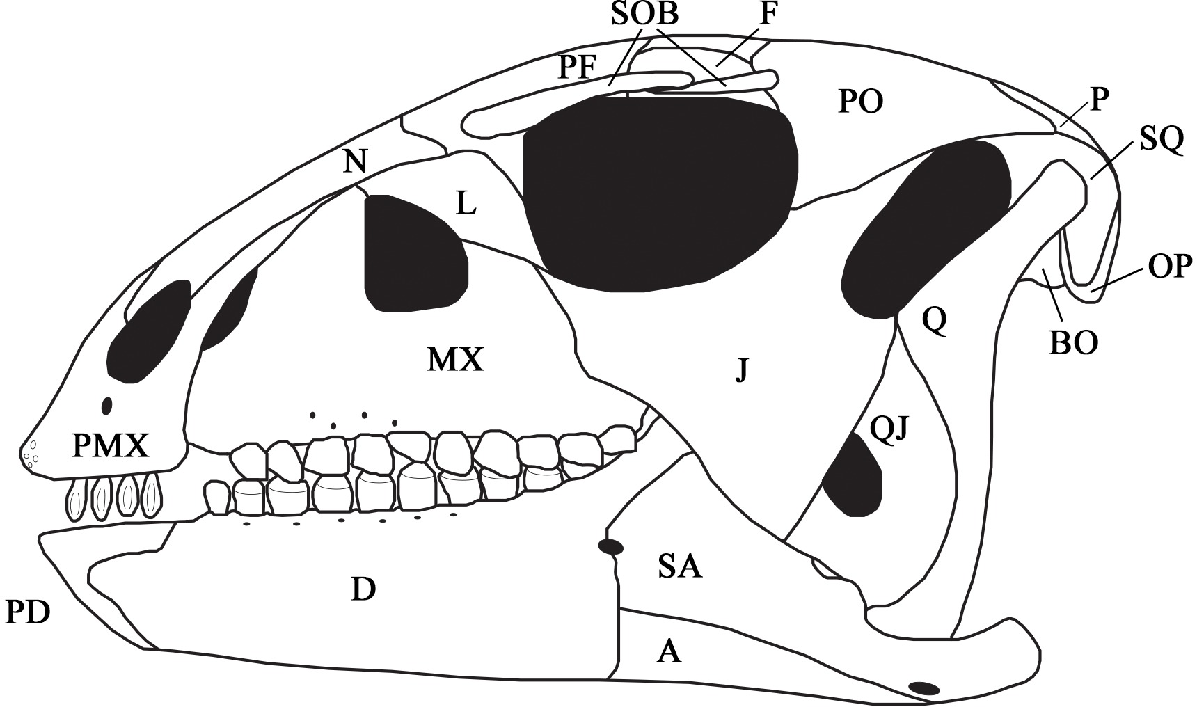Diagrama da mandíbula de Hypsilophodon foxii baseado no material figurado em Galton (1974). A morfologia mandibular é um dos caracteres fisiológicos relevantes para estudos de crescimento e dieta do grupo.