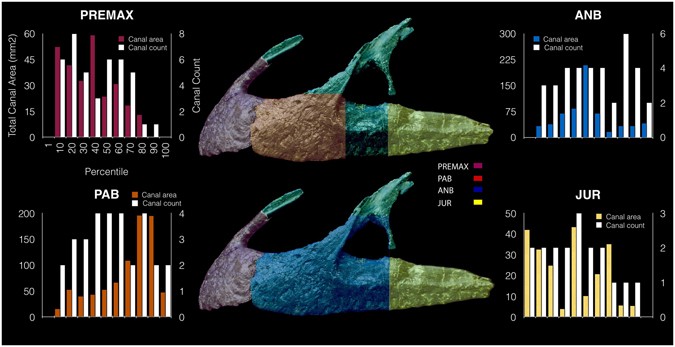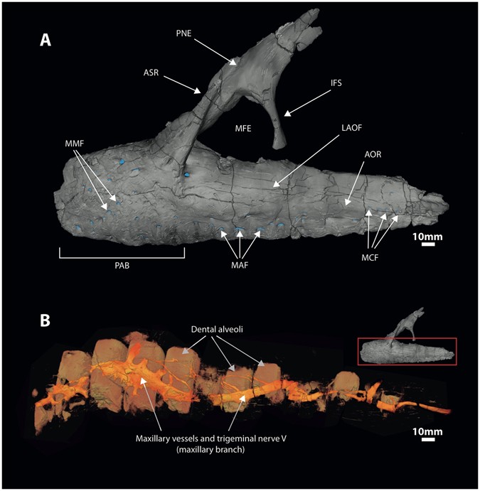 Estudo de tomografia computadorizada micro-foco (µCT) do focinho do holótipo de Neovenator (MIWG), revelando uma rede anastomótica extensa de grandes canais neurovasculares na pré-maxila e maxila. Esses canais são interpretados como ramos do nervo trigêmeo, com terminações na superfície externa dos ossos associadas a forames que sugerem alta sensibilidade facial. A descoberta é comparável à neurovasculatura de crocodilos e aves que dependem da sensação tátil do focinho para caça e manipulação de alimentos. Apesar dessa complexidade, os autores argumentam que o Neovenator não apresenta adaptações para comportamento aquático ou alimentação especializada, sendo um predador terrestre típico com focinho táctil altamente desenvolvido.