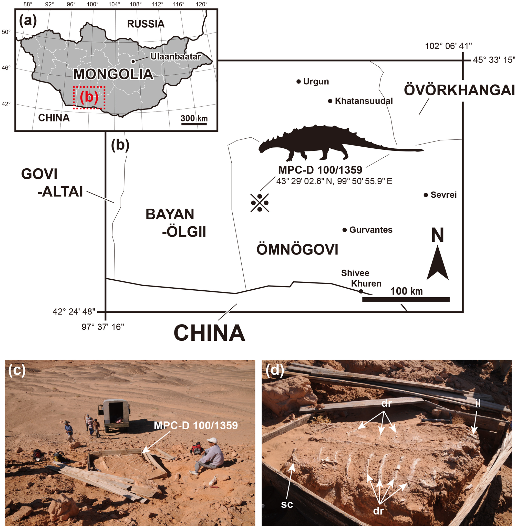 Descrição de um esqueleto pós-craniano articulado (MPC-D 100/1359) da Formação Baruungoyot (Campaniano médio a superior, Hermiin Tsav, sul do Gobi), com doze vértebras dorsais, costelas, cinturas peitoral e pélvica, membros e osteodermos livres. A análise mostra que ancilossaurídeos asiáticos como Pinacosaurus evoluíram corpos rígidos com número reduzido de falanges pedais, e que havia pelo menos duas formas de armadura de flanco dentro da família.